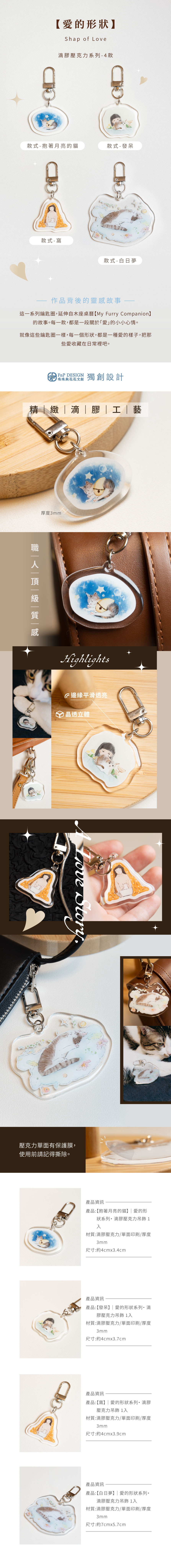 這一系列鑰匙圈,延伸自木座桌曆【My Furry Companion】的故事。每一款,都是一段關於「愛」的小小心情。職人質感滴膠壓克力吊飾尺寸有兩種可挑選:5cm x 5cm內-3款、7cm x 7cm內-1款。快來把那些愛收藏在日常裡吧。